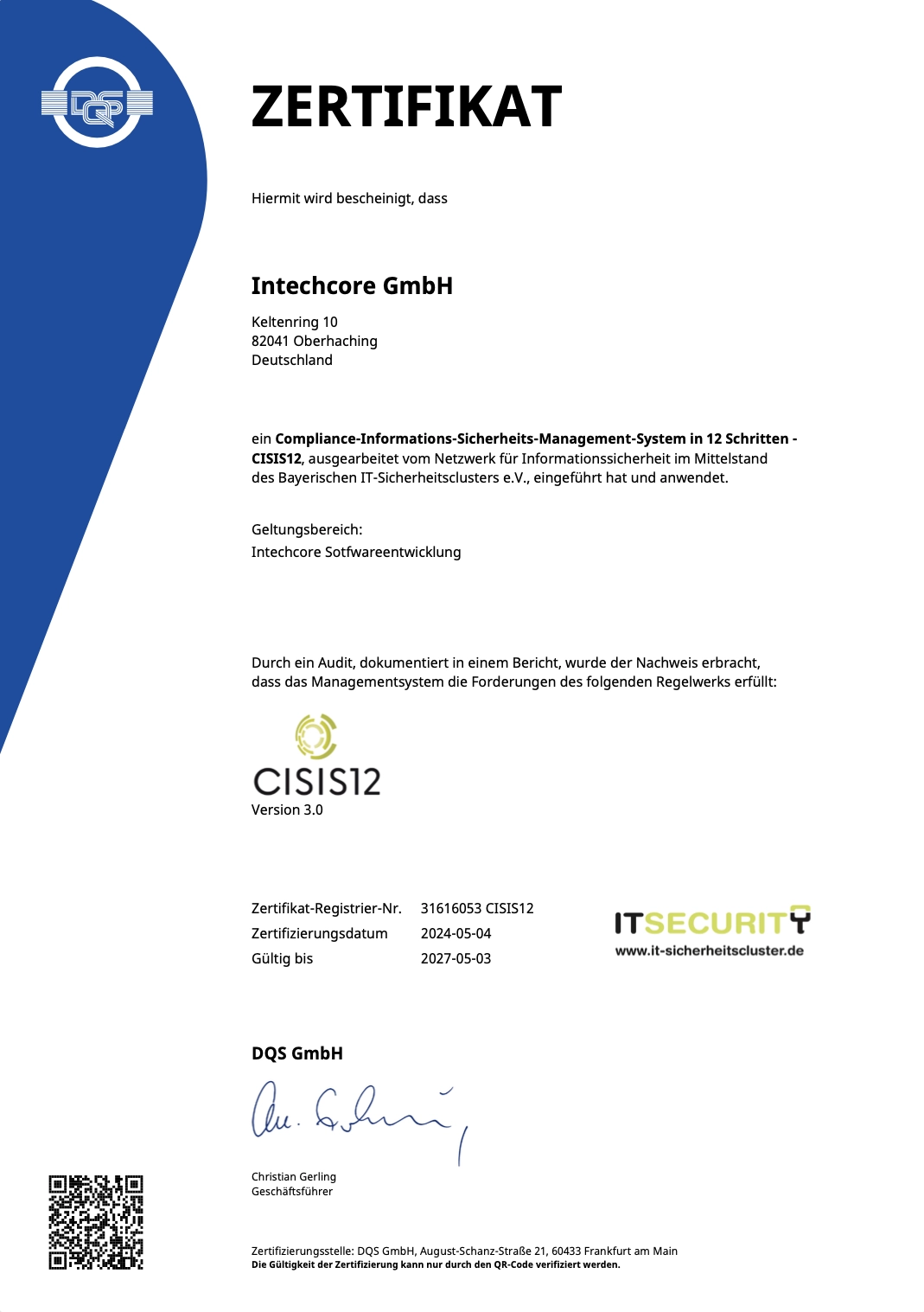Mehr über unsere Einführung und Umsetzung von CISIS12 lesen Sie in unserem Artikel „Einführung von CISIS12 bei Intechcore“.
